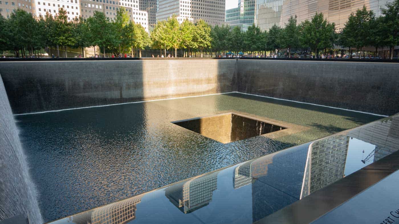9/11 memorial. Mattias Brännholm i New York. 9/11 memorial. Här stod det södra tornet. Hela området är idag en minnespark.